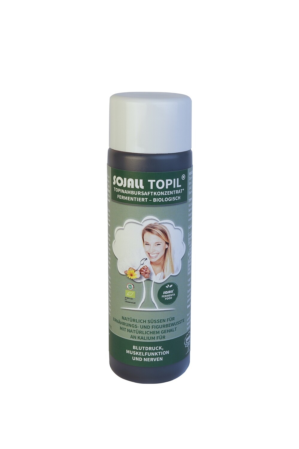 SOJALL Topil ist ein wertvolles fermentiertes Bio-Lebensmittel mit natürlichem Fruchtzuckergehalt, hergestellt aus dem Saft der Topinamburknolle. SOJALL Topil schmeckt, unterstützt die Gesundheit und eignet sich hervorragend zum Süßen von Speisen wie auch Getränken. SOJALL Topil ist reich an Kalium. Täglich verzehrt trägt diese Quelle zur Aufrechterhaltung eines normalen Blutdruck sowie zu einer normalen Funktion des Nervensystems und der Muskelfunktion bei. SOJALL Topil ist für Jung und Alt ebenso wie für Sportler eine gesunde Alternative zu Zucker. Topinambur enthält von Natur aus die wertvollen Ballaststoffe Inulin und Oligofructose sowie zahlreiche Mineralstoffe. Inulin ist ein Ballaststoff. Es quillt als Ballaststoff im Magen-Darm-Trakt auf und kann von Bifidobakterien verstoffwechselt werden bzw. dient ihnen vorteilhafter weise als Nahrung. Bifidobakterien kommen unter anderem in der Muttermilch vor, die für Säuglinge bekanntlich das Beste ist. Oligofructose ist ein Mehrfachzucker, der zwischen 30 und 50 % der Süßkraft von Saccharose aufweist und daher als natürlicher Zuckeraustauschstoff ideal ist.